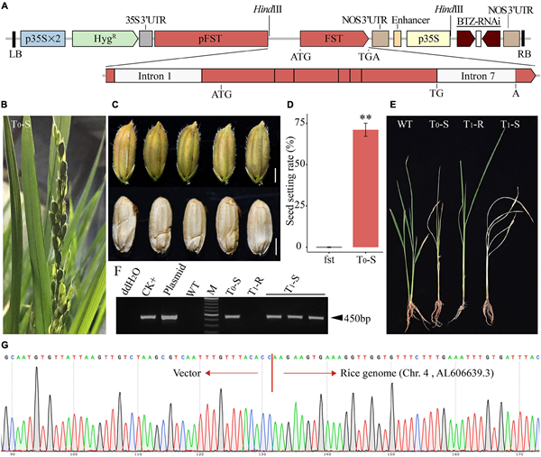 隨后,研究團隊在該校稻作研究所植物分子育種實驗室構(gòu)建了用于轉(zhuǎn)基因水稻雌性育性互補的FST基因表達元件,以及用于轉(zhuǎn)基因篩除的苯達松除草劑敏感致死的功能性RNAi元件,并將其緊密連鎖后導(dǎo)入水稻雌性核不育系中,成功創(chuàng)制了基因工程水稻雌性不育系,實現(xiàn)了非轉(zhuǎn)基因雌性核不育系種苗的繁殖。