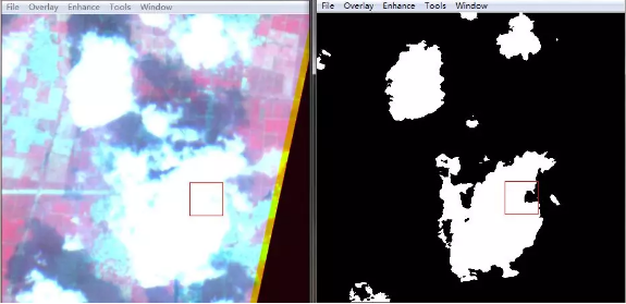 從圖1的“珠海一號”高光譜遙感衛(wèi)星影像中可以看到,研究區(qū)域的東南區(qū)域存在部分云量,在分類之前需要先將云掩膜去除。云的光譜特征曲線如圖2所示,云的反射率在480nm~866nm之間具有較高的值,而在紅光范圍內(nèi)640nm附近處于相對較低的反射率。根據(jù)這一特點,將云提取出來。結(jié)果如圖3所示。