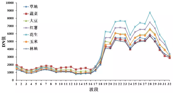 我們將實地提取的農(nóng)作物進行分析得出平均光譜,如下圖所示,將農(nóng)作物分為玉米、紅薯、大豆、花生、蔬菜、草地、林地、其他植被和非植被(水體、建筑、裸地和道路)。