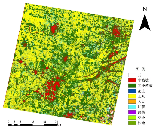 實驗利用“珠海一號”高光譜遙感衛(wèi)星影像數(shù)據(jù),結(jié)合實地調(diào)查樣點,基于決策樹分類方法,對研究區(qū)土地覆蓋類型進行分類,利用驗證樣點基于混淆矩陣并利用實測點對分類結(jié)果進行精度驗證Kappa系數(shù)為0.95,總體精度達95.94%,精度評價結(jié)果如下表1所示,其中花生、玉米、大豆、紅薯、蔬菜具有較高的分類精度,花生和玉米存在小部分混分,由于遙感影像不可避免會存在“同譜異物”現(xiàn)象,導(dǎo)致蔬菜和其他植被存在混分現(xiàn)象。