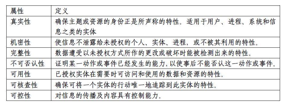 信息安全是指對(duì)信息系統(tǒng)的硬件、軟件、系統(tǒng)中的數(shù)據(jù)及依托其開展的業(yè)務(wù)進(jìn)行保護(hù),使得它們不會(huì)由于偶然的或者惡意的原因而遭到未經(jīng)授權(quán)的訪問、泄露、破壞、修改、審閱、檢查、記錄或銷毀,保證信息系統(tǒng)連續(xù)可靠地正常運(yùn)行。信息安全具有真實(shí)性、機(jī)密性、完整性、不可否認(rèn)性、可用性、可核查性和可控性七個(gè)主要屬性: