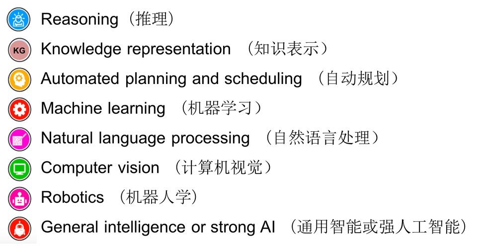 人工智能的目標(biāo)包括:推理、知識表示、自動(dòng)規(guī)劃、機(jī)器學(xué)習(xí)、自然語言理解、計(jì)算機(jī)視覺、機(jī)器人學(xué)和強(qiáng)人工智能八個(gè)方面。知識表示和推理包括:命題演算和歸結(jié),謂詞演算和歸結(jié),可以進(jìn)行一些公式或定理的推導(dǎo)。自動(dòng)規(guī)劃包括機(jī)器人的計(jì)劃、動(dòng)作和學(xué)習(xí),狀態(tài)空間搜索,敵對搜索,規(guī)劃等內(nèi)容。機(jī)器學(xué)習(xí)這一研究領(lǐng)域是由AI的一個(gè)子目標(biāo)發(fā)展而來,用來幫助機(jī)器和軟件進(jìn)行自我學(xué)習(xí)來解決遇到的問題。自然語言處理是另一個(gè)由AI的一個(gè)子目標(biāo)發(fā)展而來的研究領(lǐng)域,用來幫助機(jī)器與真人進(jìn)行溝通交流。計(jì)算機(jī)視覺是由AI的目標(biāo)而興起的一個(gè)領(lǐng)域,用來辨認(rèn)和識別機(jī)器所能看到的物體。機(jī)器人學(xué)也是脫胎于AI的目標(biāo),用來給一個(gè)機(jī)器賦予實(shí)際的形態(tài)以完成實(shí)際的動(dòng)作。