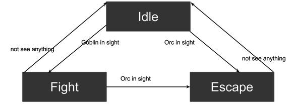 首先要說一下有限狀態(tài)機(jī)(FSM),一般應(yīng)用于游戲機(jī)器人,網(wǎng)絡(luò)協(xié)議,正則表達(dá)式,詞法語法分析,自動(dòng)客服等。如下圖是一個(gè)簡單的游戲機(jī)器人狀態(tài)轉(zhuǎn)移和行動(dòng)圖。