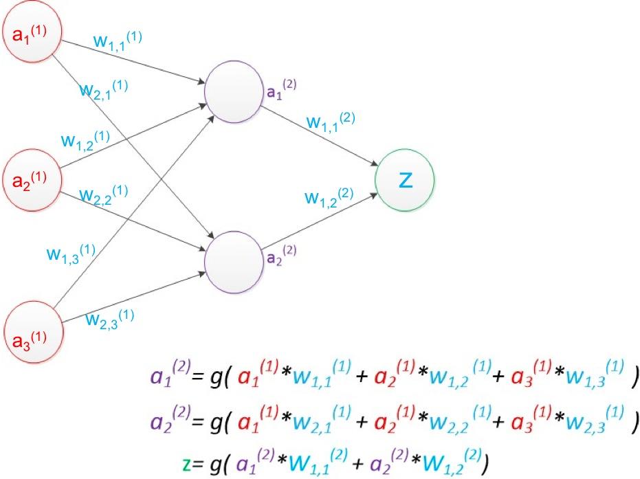深度學(xué)習(xí)是機(jī)器學(xué)習(xí)中人工神經(jīng)網(wǎng)絡(luò)算法的延伸和發(fā)展,近期深度學(xué)習(xí)的研究非常火熱,就在這里介紹一下神經(jīng)網(wǎng)絡(luò)和深度學(xué)習(xí)。先說兩層網(wǎng)絡(luò),如下圖,其中a是“單元”的值,w表示“連線”權(quán)重,g是激活函數(shù),一般為方便求導(dǎo)采用sigmoid函數(shù)。采用矩陣運(yùn)算來簡化圖中公式:a(2) = g( a(1) * w(1) ), z = g( a(2) * w(2) )。設(shè)訓(xùn)練樣本的真實(shí)值為y,預(yù)測值為z,定義損失函數(shù) loss = (z – y)2,所有參數(shù)w優(yōu)化的目標(biāo)就是使對所有訓(xùn)練數(shù)據(jù)的損失和盡可能的小,此時(shí)這個(gè)問題就被轉(zhuǎn)化為一個(gè)優(yōu)化問題,常用梯度下降算法求解。一般使用反向傳播算法,從后往前逐層計(jì)算梯度,并最終求解各參數(shù)矩陣。