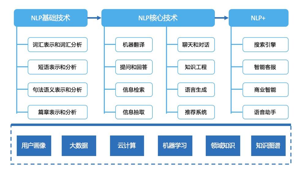 NLP是人工智能的另一個(gè)目標(biāo),用于分析、理解和生成自然語言,以方便人和計(jì)算機(jī)設(shè)備進(jìn)行交流,以及人與人之間的交流。它的應(yīng)用領(lǐng)域包括:機(jī)器翻譯,文本、語音、圖片轉(zhuǎn)換,聊天機(jī)器人,自動(dòng)摘要,情感分析,文本分類,信息提取等。以下給出了自然語言處理簡要的知識架構(gòu)圖。